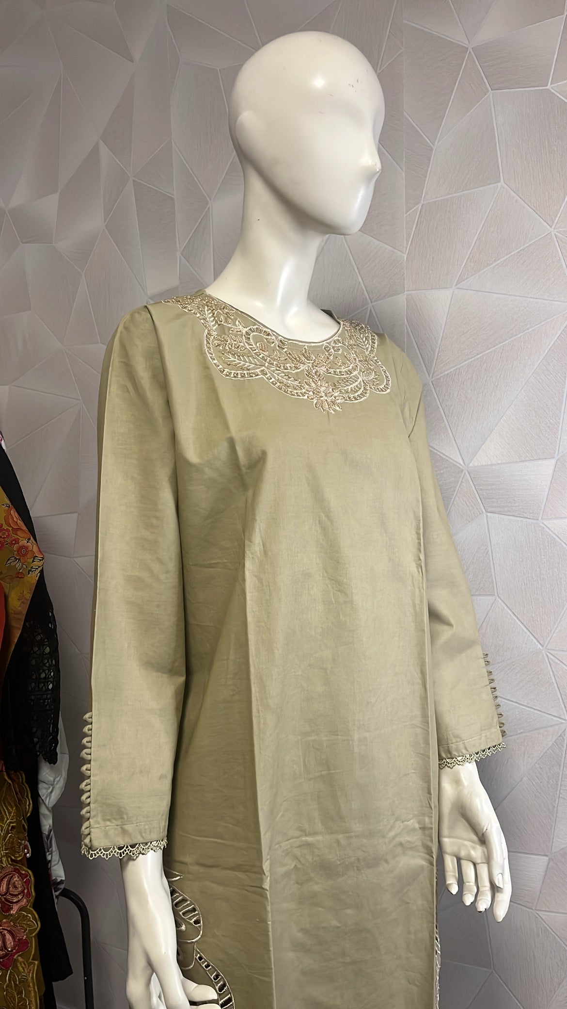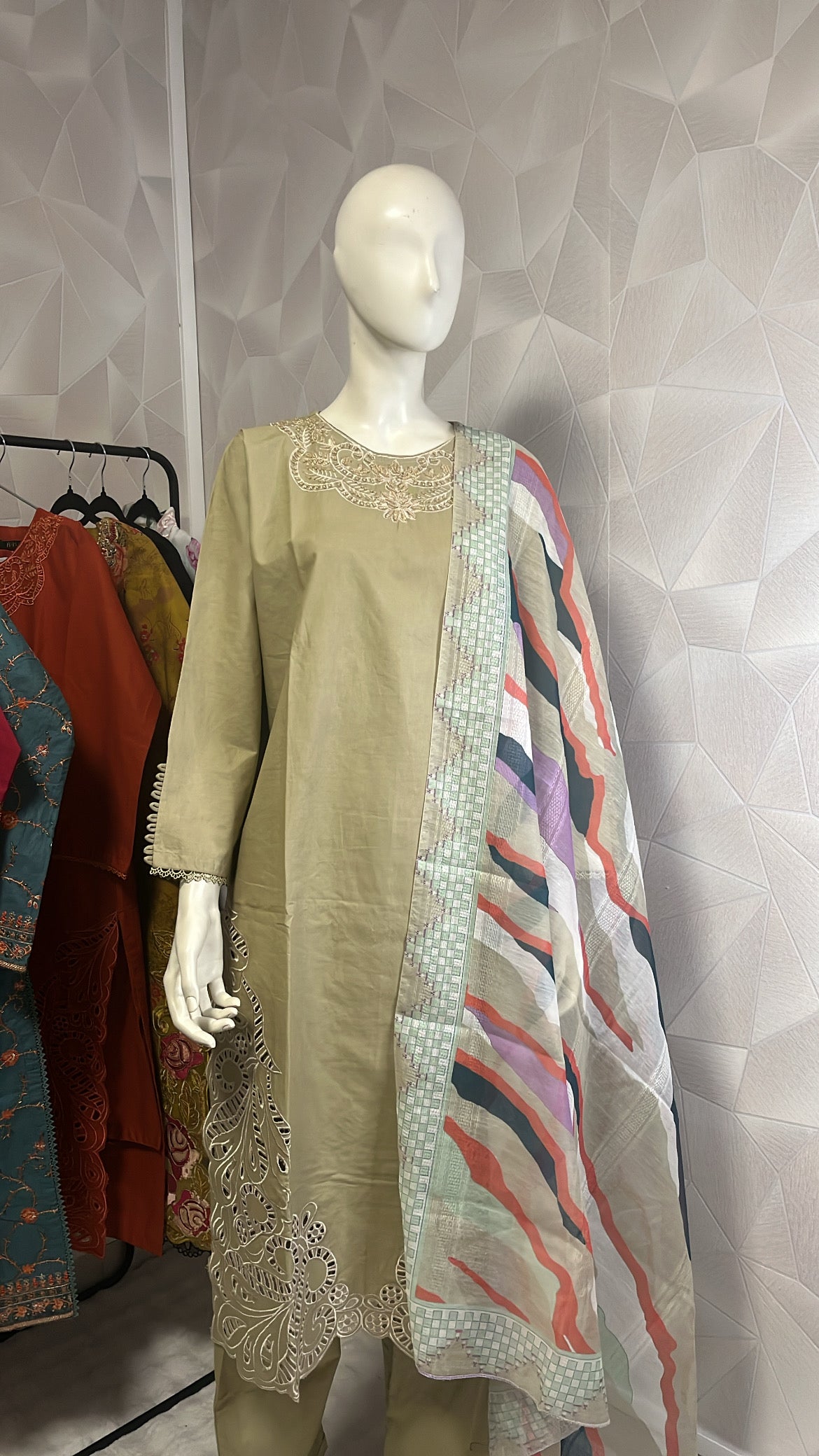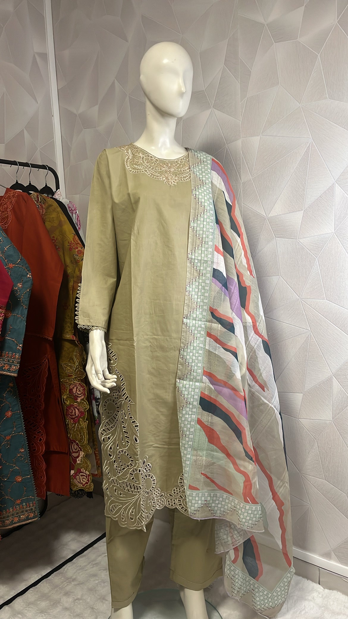 Cet ensemble 3 pièces vert pâle en coton épais de haute qualité est orné de motifs fleuris élégants vers le bas. Le dupata assorti ajoute une touche de beauté supplémentaire. Profitez du confort et du style raffiné de cette tenue de qualité supérieure.